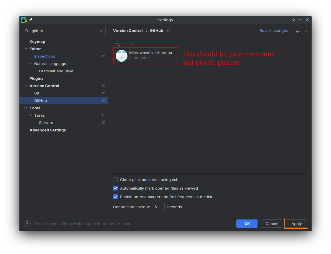You should now see your GitHub username and profile picture in the settings panel. Click