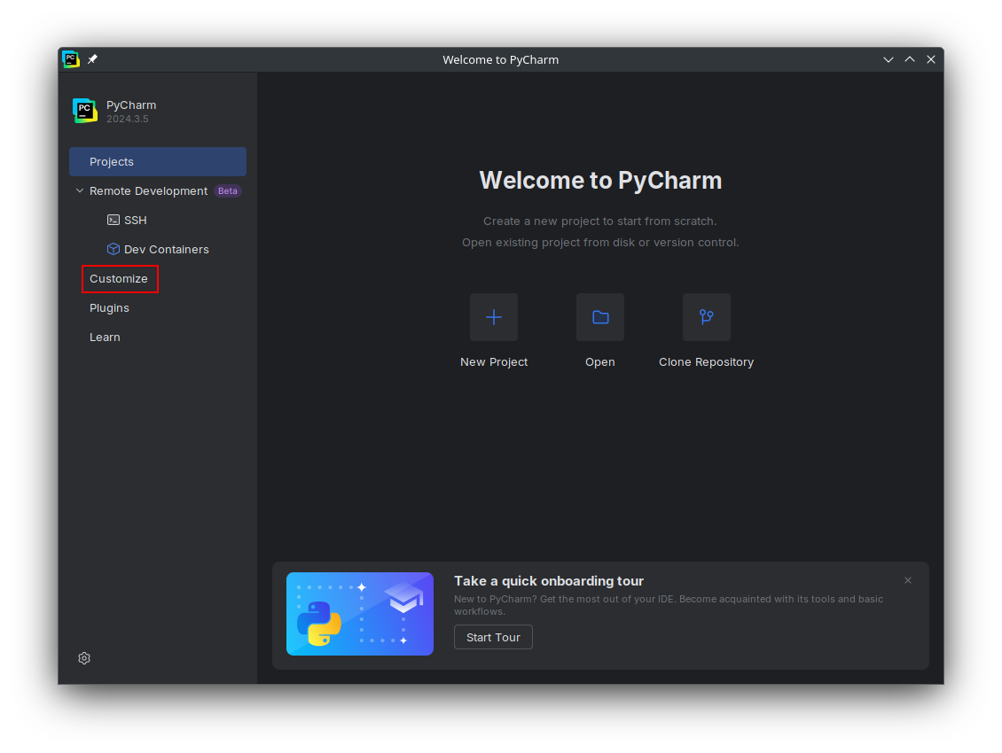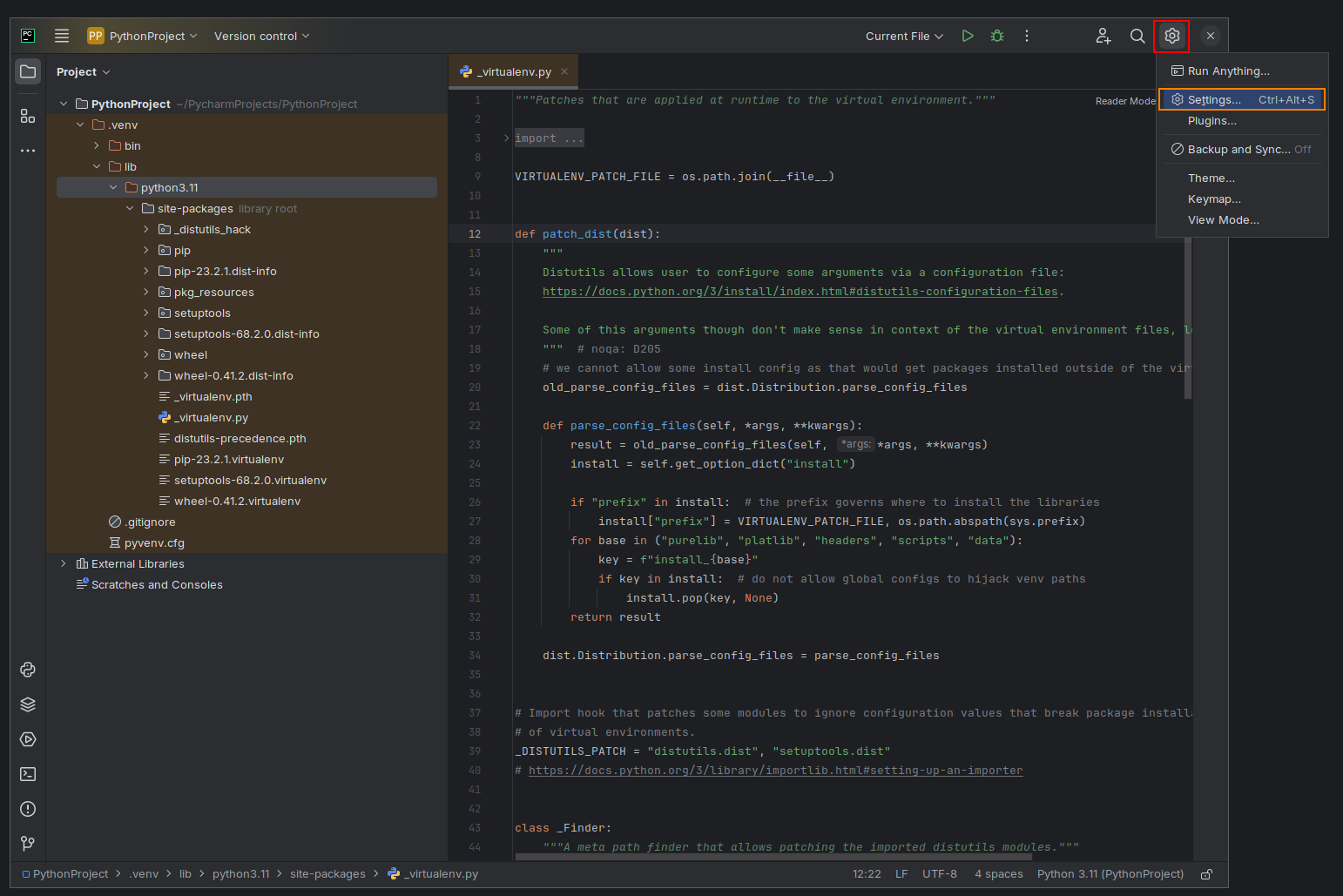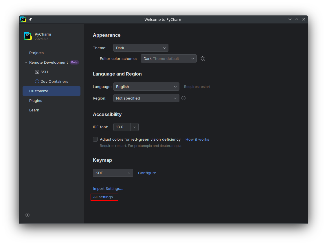 Opening PyCharm Settings