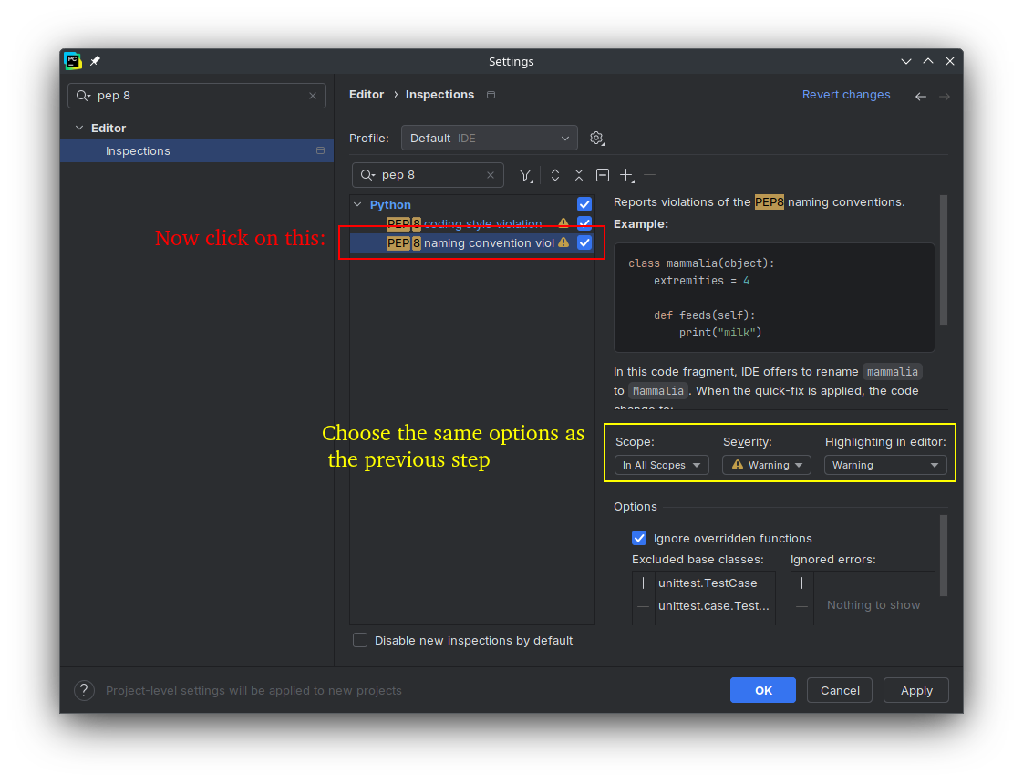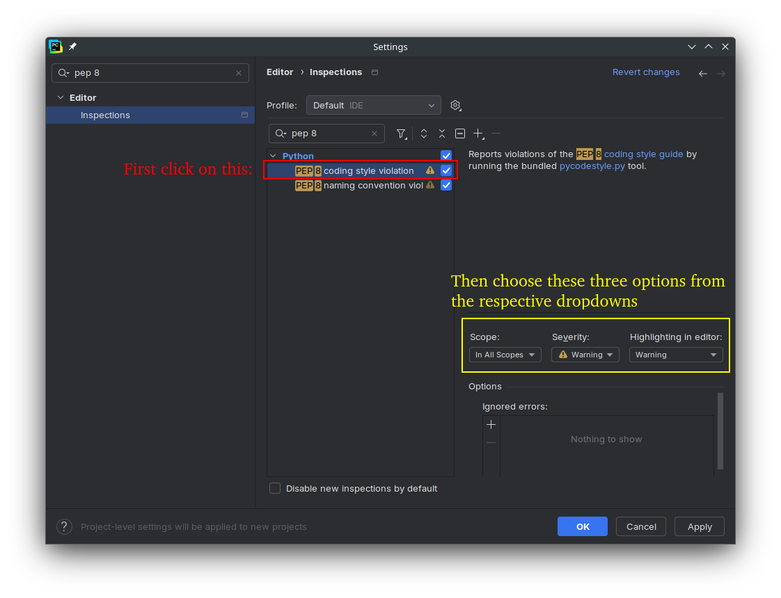 PEP 8 coding style violation, and set the Scope toIn All Scopes, set the Severity toWarning, and set the Highlighting in editor toWarning.
